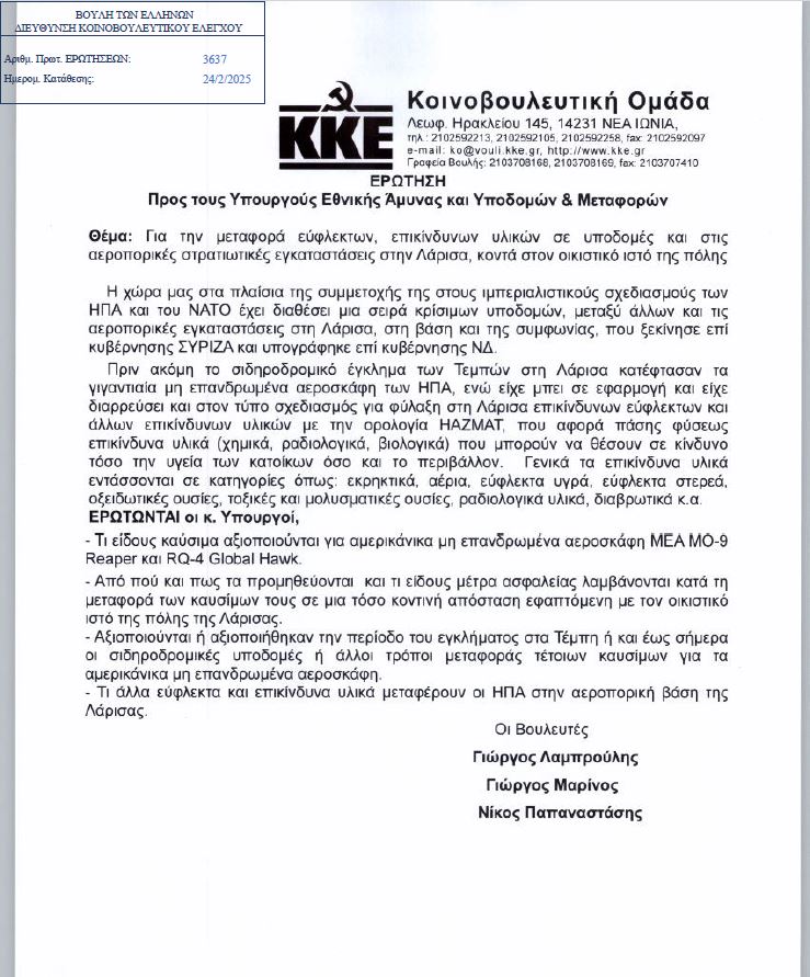 Στην ερώτηση που υπογράφουν οι βουλευτές του ΚΚΕ Γιώργος Λαμπρούλης, Γιώργος Μαρίνος, Νίκος Παπαναστάσης και απευθύνεται και στον Υπουργό Υποδομών και Μεταφορών, σημειώνεται ότι «η χώρα μας στα πλαίσια της συμμετοχής της στους ιμπεριαλιστικούς σχεδιασμούς των ΗΠΑ και του ΝΑΤΟ έχει διαθέσει μια σειρά κρίσιμων υποδομών, μεταξύ άλλων και τις αεροπορικές εγκαταστάσεις στη Λάρισα, στη βάση και της συμφωνίας, που ξεκίνησε επί κυβέρνησης ΣΥΡΙΖΑ και υπογράφηκε επί κυβέρνησης ΝΔ».