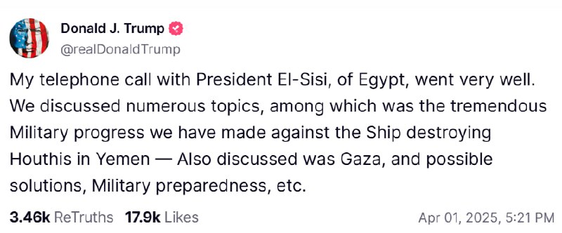 Ο πρόεδρος των ΗΠΑ Ντόναλντ Τραμπ και ο Αιγύπτιος πρόεδρος Αμπντέλ Φατάχ αλ Σίσι συζήτησαν για τις προσπάθειες κατάπαυσης του πυρός στη Γάζα και την εκστρατεία εναντίον των Χούθι.