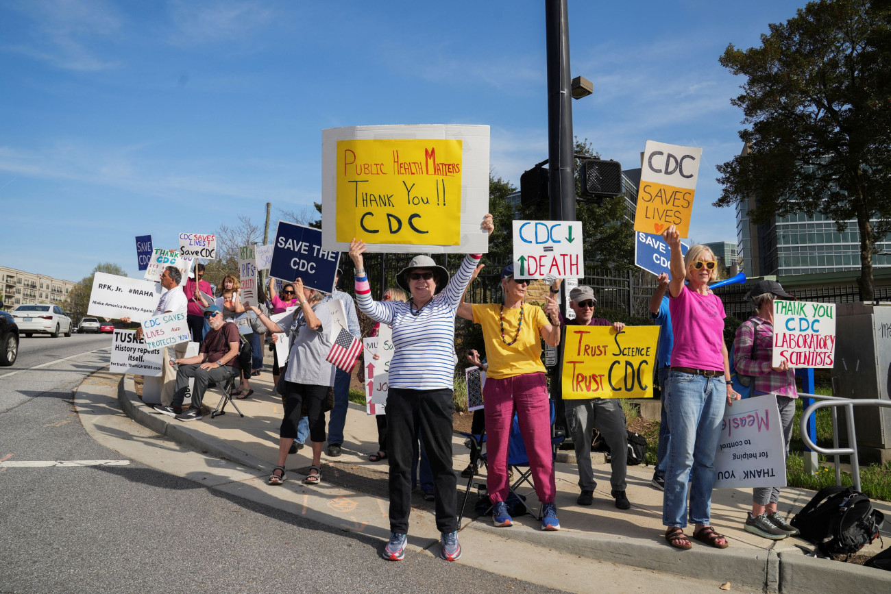 Διαδηλωτές διαμαρτύρονται για τις απολύσεις έξω από τα κεντρικά γραφεία των CDC στην Ατλάντα της Τζόρτζια (Reuters)