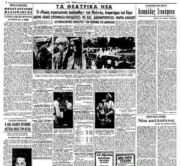 Μια ακόμη λεπτομέρεια της παρουσιάσεως του έργου: Τον ρόλο του Κωνσταντίνου στη μεθαυριανή πρεμιέρα θα τον υποδυθή ο νέος τενόρος Δ. Τσακιρίδης, μαθητής του Καλομοίρη. Τον διάλεξε ο ίδιος ο συνθέτης του «Παλαιολόγου». Στις επόμενες παραστάσεις το μέρος του Κωνσταντίνου θα τραγουδούν εναλλάξ οι Γ. Κοκκολιός και Δ. Τσακιρίδης.