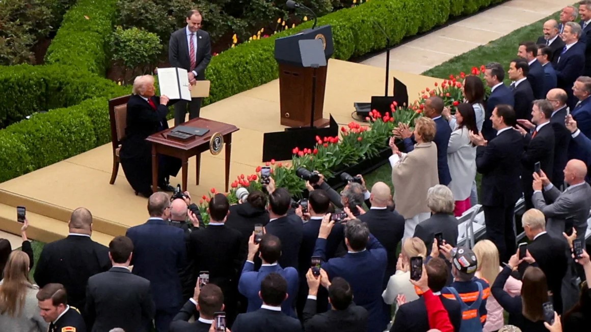 Σε μια σουρεαλιστική εμφάνιση στον Κήπο των Ρόδων του Λευκού Οίκου την Τετάρτη, ο Τραμπ γαντζώθηκε πάνω σε μια μεγάλη αφίσα που έδειχνε τους νέους δασμολογικούς συντελεστές, καθώς… λικνιζόταν στον άνεμο. Ο κόσμος είδε έναν ασυγκράτητο πρόεδρο στο επίκεντρο της δημοσιότητας που λατρεύει, να διακινδυνεύει τις οικονομικές τύχες δισεκατομμυρίων ανθρώπων με ένα παράξενο πολιτικό στοίχημα.