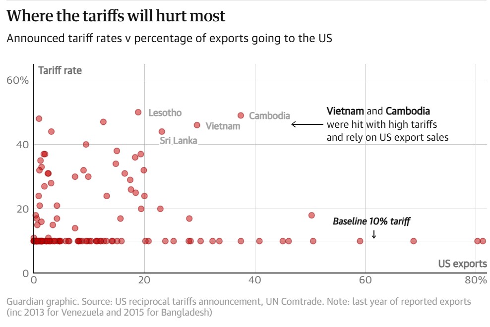 Οι δασμοί, οι οποίοι πρόκειται να τεθούν σε ισχύ στις 9 Απριλίου, κυμαίνονται από 10% έως 50% και υπολογίστηκαν με έναν τύπο που οι οικονομολόγοι χαρακτήρισαν «ηλίθιο», τιμωρώντας τις χώρες που έχουν τα υψηλότερα εμπορικά πλεονάσματα με τις ΗΠΑ σε σχέση με τις εισαγωγές τους από τις ΗΠΑ.