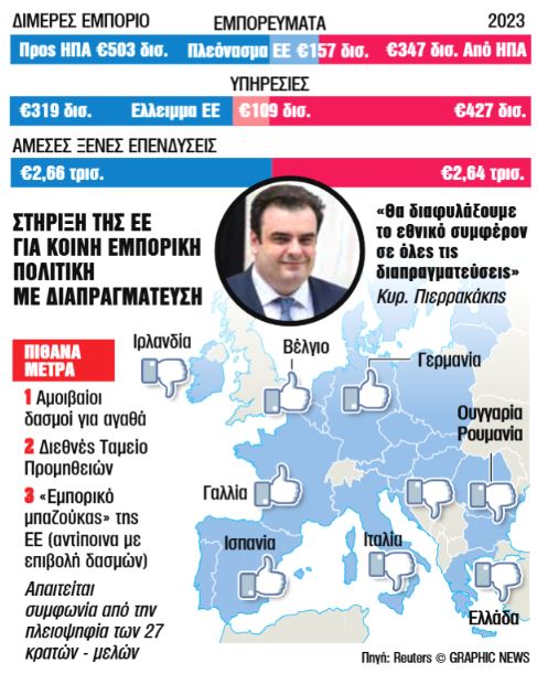 Με την Ευρώπη να είναι έτοιμη για το μεγάλο παζάρι με τις ΗΠΑ για τους δασμούς που ανακοίνωσε η κυβέρνηση Τραμπ βάζοντας στο τραπέζι μια πρόταση για δασμούς «μηδέν εσείς, μηδέν εμείς» σε όλα τα βιομηχανικά προϊόντα, η Ελλάδα συντάσσεται με τις αποφάσεις της Κομισιόν και τάσσεται υπέρ μιας διαπραγματευτικής γραμμής η οποία θα ξεδιπλώνεται βήμα βήμα ανάλογα με τις εξελίξεις στις συνομιλίες και τις αποφάσεις.