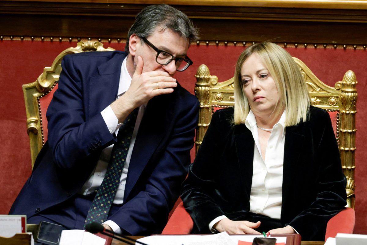 Η πρωθυπουργός της Ιταλίας, Τζόρτζια Μελόνι, βυθίζεται στο έδρανο της Γερουσίας στη Ρώμη, ακούγοντας όσα της ψιθυρίζει στο αυτί ο υπουργός Οικονομίας Τζανκάρλο Τζορτζέτι (REUTERS/Remo Casilli/File Photo)