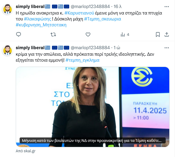 Την ώρα που οι αποκαλύψεις για την «Ομάδα Αλήθειας» της ΝΔ «δείχνουν» ένα καλά οργανωμένο σύστημα παραπληροφόρησης και προπαγάνδας, τρολ συνδεδεμένα και με την εν λόγω ομάδα εξαπέλυαν χυδαία επίθεση εναντίον της Μαρίας Καρυστιανού, που παραχώρησε συνέντευξη Τύπου για το έγκλημα των Τεμπών