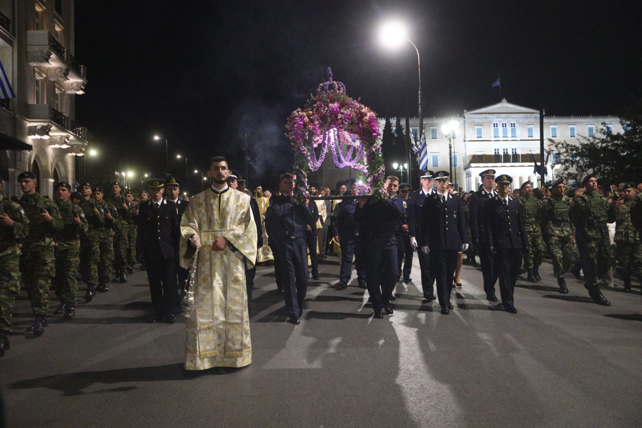 Ακολούθησε η Περιφορά του Επιταφίου στο κέντρο της Αθήνας, στη διάρκεια της οποίας ψάλθηκαν τα Εγκώμια σε τρεις στάσεις, μια από τις οποίες πραγματοποιήθηκε μπροστά από τη Βουλή και το Μνημείο του Αγνώστου Στρατιώτου. Στα εγκώμια ακούστηκε και το μοιρολόι της Παναγίας «Ὢ γλυκύ µου ἔαρ, γλυκύτατόν µου τέκνον, ποῦ ἔδυ σου τὸ κάλλος;».