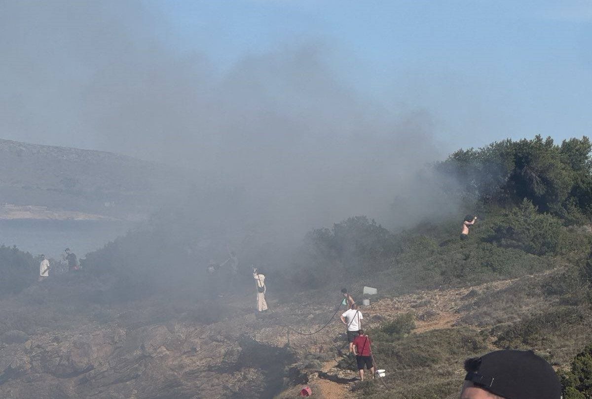 Αρχικά στο σημείο έσπευσαν περίοικοι και όσοι βρίσκονταν κοντά στην παραλία και με κουβάδες προσπάθησαν να περιορίσουν τις φλόγες.