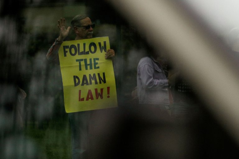 Η κυβέρνηση Τραμπ διεξάγει «επίθεση εναντίον του κράτους του δικαίου» και πρέπει να εμποδιστεί «να καταστρατηγήσει τα δικαιώματα κόσμου που ζει εδώ», λέει ο 41χρονος Μπέντζαμιν Ντάγκλας, ο οποίος φοράει παλαιστινιακή μαντίλα στον λαιμό και κρατάει πλακάτ υποστήριξης στον Μαχμούντ Χαλίλ που κινδυνεύει να απελαθεί για τις κινητοποήσεις υπέρ των Παλαιστινίων πέρυσι στο Κολούμπια.