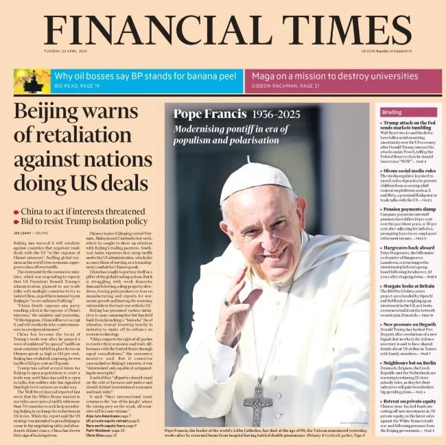 «Εκσυγχρονιστής ποντίφικας σε μια εποχή λαϊκισμού και πόλωσης» είναι ο τίτλος των Financial Times για τον ηγέτη της Καθολικής Εκκλησίας, που ήταν γνωστός για τις προσπάθειές του να γεφυρώσει πολιτικά και θρησκευτικά χάσματα.