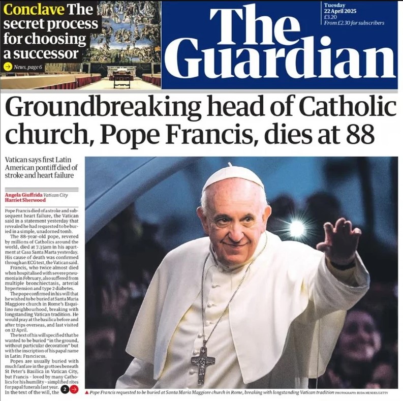 Guardian: «Ο πρωτοποριακός ηγέτης της Καθολικής Εκκλησίας, Πάπας Φραγκίσκος, πεθαίνει σε ηλικία 88 ετών»