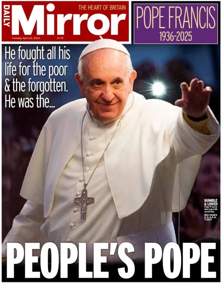 «Ο πάπας του λαού», γράφει η Daily Mirror, για έναν ποντίφικα που πάλεψε όλη του τη ζωή για τους φτωχούς και τους ξεχασμένους.