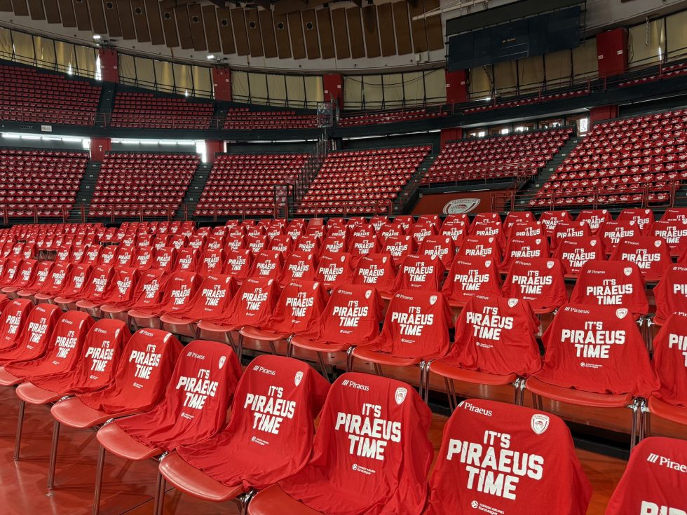 Συγκεκριμένα, θα υπάρχει ένα κόκκινο μπλουζάκι με το σύνθημα «IT’S PIRAEUS TIME», σε κάθε κάθισμα του γηπέδου, με στόχο να μπορούν όλοι να έχουν ένα χρώμα για να στηρίξουν την ομάδα τους.
