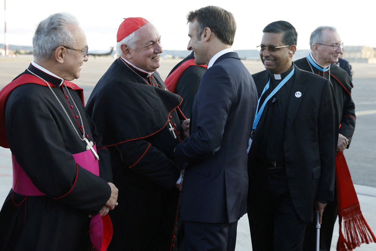 Ο Εμανουέλ Μακρόν με τον Καρδινάλιο Ζαν Μαρκ Αβελίν και αρχιεπίσκοπο Μασσαλίας, στη Μασσαλία όπου υποδέχθηκε τον Πάπα Φραγκίσκο.