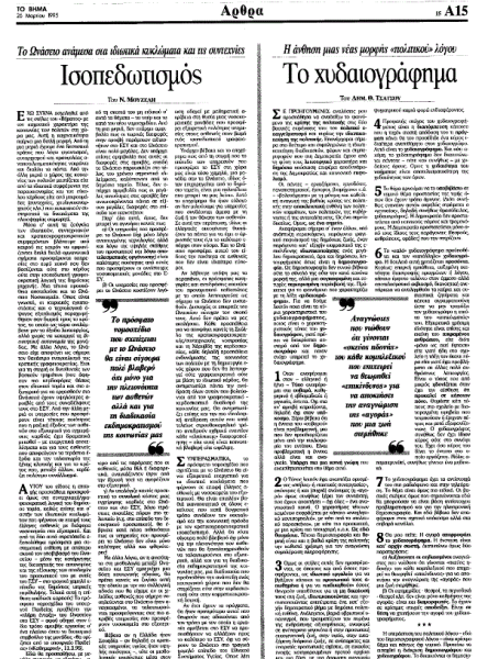 1. Όταν αναφέρομαι στον —ελληνικό ή ξένο— Τύπο, αναφέρομαι στα σοβαρά, καθημερινά ή εβδομαδιαία ή μηνιαία, έντυπα. Όχι στα επ’ αμοιβή κιτρινίζοντα, δηλαδή όχι στον υπόκοσμο. Ξέρω βέβαια ότι η έννοια του «σοβαρού» είναι προβληματική, μια που δεν προσδιορίζεται μόνο από την κυκλοφορία του εντύπου. Είναι προβληματική η έννοια αλλά είναι και αναγκαία. Υπάρχει πια μια κοινή γνώμη που ευαισθητοποιείται στο θέμα αυτό.