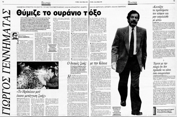 Το συγκεκριμένο κείμενο, τμήμα του αφιερώματος που είχε ετοιμάσει ο προ ολίγων μηνών αποβιώσας δημοσιογράφος (1945-2024) στον Γιώργο Γεννηματά, έφερε τον τίτλο «Ο δεσμός ζωής με την Κάκια» και είχε δημοσιευτεί στο φύλλο της 3ης Μαΐου 1994.