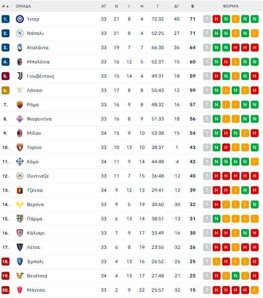 Η ομάδα του Μιλάνου έφτασε τους 54 βαθμούς, στο -5 από την έκτη Λάτσιο, και συνεχίζει να δίνει μάχη για ευρωπαϊκό εισιτήριο. Προτελευταία η Βενέτσια με 25 βαθμούς.