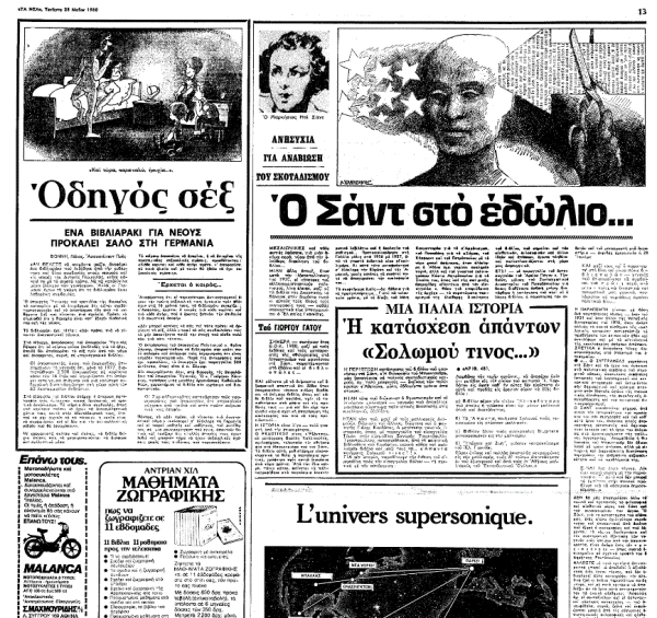 Στο φύλλο των «Νέων» που είχε κυκλοφορήσει την Τετάρτη 28 Μαΐου 1980 υπήρχε ένα άρθρο του δημοσιογράφου και συγγραφέα Γιώργου Γάτου (1931-2010), που έφερε τον τίτλο «Ο Σαντ στο εδώλιο…» και αναφερόταν στο ζήτημα της κατάσχεσης του βιβλίου του μαρκησίου ντε Σαντ «Η φιλοσοφία στο μπουντουάρ» (εκδόσεις Εξάντας, Δεκέμβριος 1979), όπως και της παραπομπής των εκδοτών, του μεταφραστή και δεκάδων βιβλιοπωλών σε δίκη.