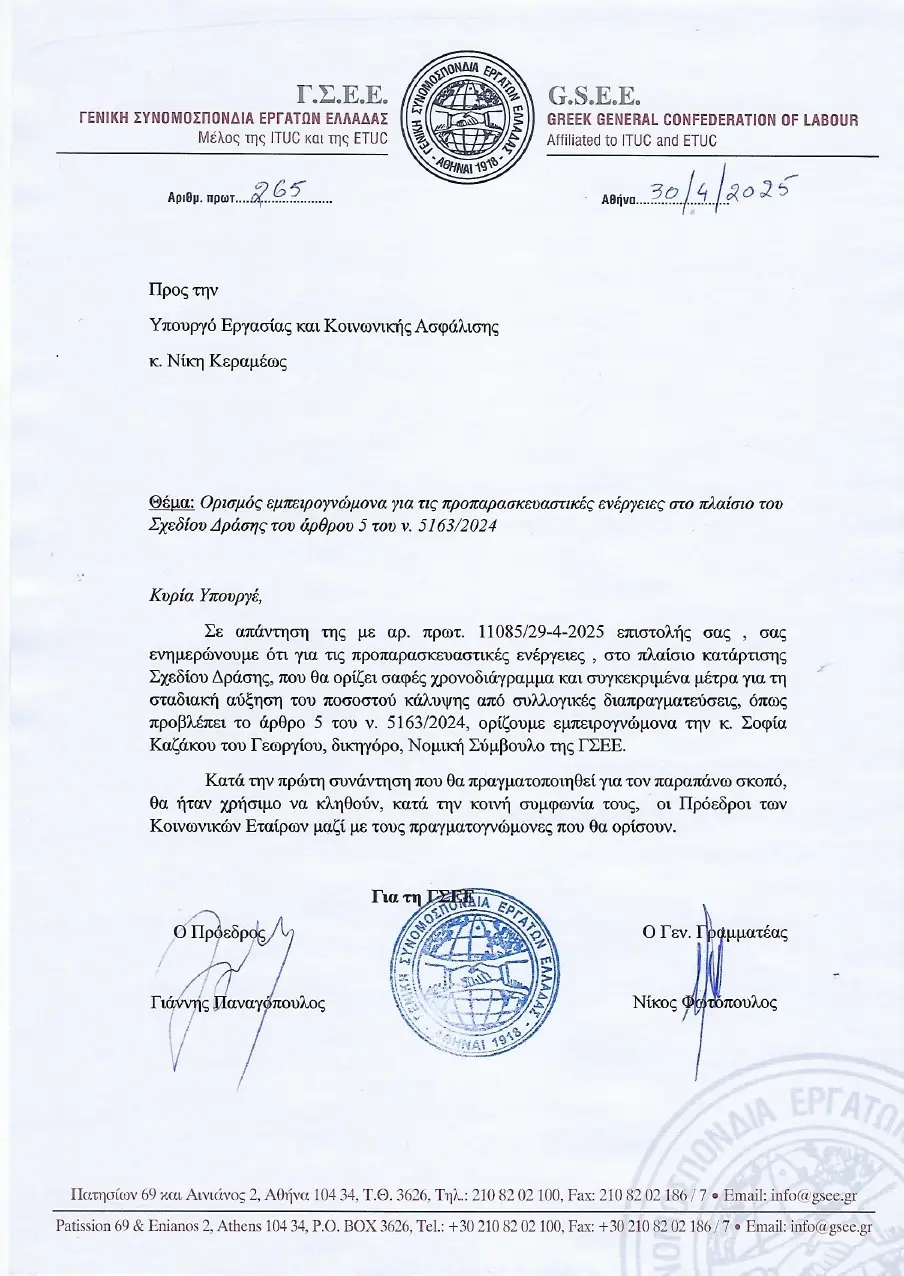 Στην επιστολή προς τους εταίρους, η υπουργός Εργασίας προαναγγέλλει την έναρξη διαλόγου με σκοπό την λήψη μέτρων για την ενίσχυση των συλλογικών διαπραγματεύσεων και την αύξηση του ποσοστού κάλυψης εργαζομένων από ΣΣΕ, όπως προβλέπει η Ευρωπαϊκή Οδηγία 2022/2041.