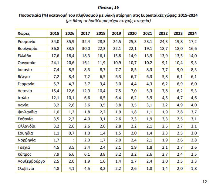 Σύμφωνα με την ΕΛΣΤΑΤ, τα ποσοστά του πληθυσμού που υποφέρουν από υλικές αυξήθηκαν στο 14%, από 13,5% το 2023. Το ποσοστό αυτό μας κατατάσσει στην τρίτη χειρότερη θέση στην Ευρώπη, μετά τη Ρουμανία και τη Βουλγαρία.