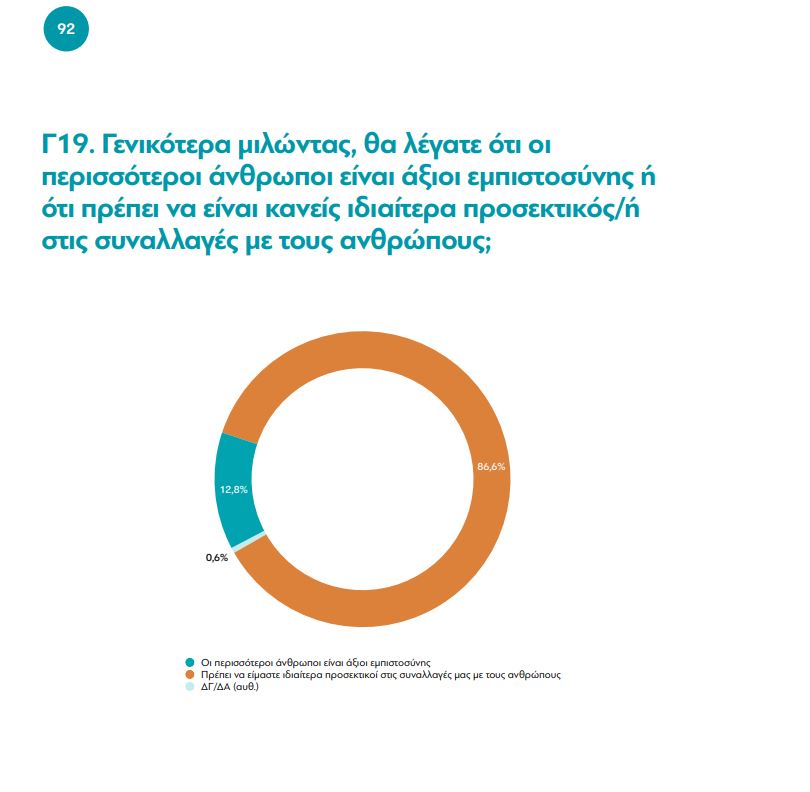 Φέτος, το 39,2% του πληθυσμού δηλώνει μηδενική ως λίγη εμπιστοσύνη στους άλλους ανθρώπους (βαθμοί 0 ως 4 της κλίμακας), ποσοστό εξαιρετικά υψηλό, αλλά σχετικά βελτιωμένο σε σχέση με πέρυσι (40,8%).