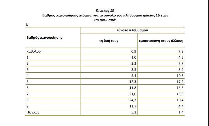 Πλήρη εμπιστοσύνη στους ανθρώπους, δηλώνει το 1,4% του πληθυσμού ηλικίας 16 ετών και άνω, ενώ καθόλου εμπιστοσύνη στους ανθρώπους δηλώνει το 7,8%.