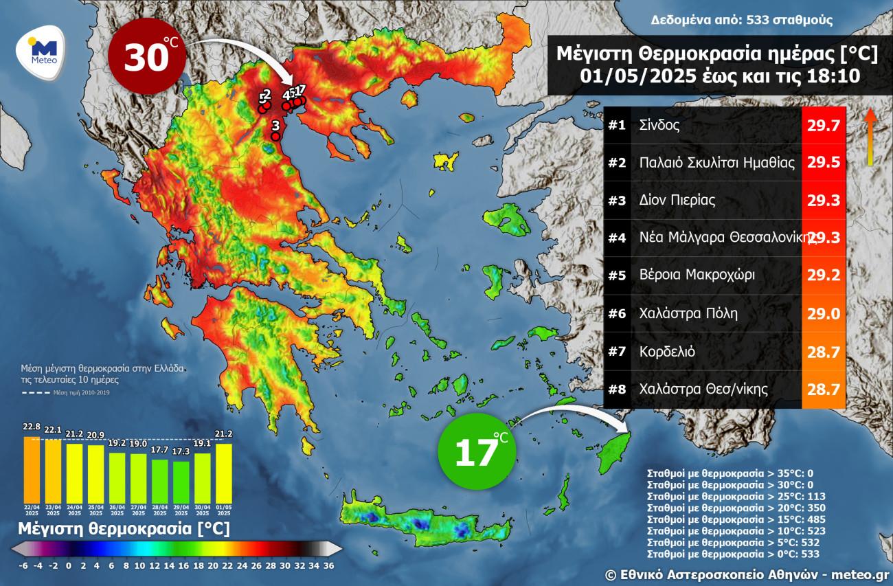 Οι μέγιστες θερμοκρασίες κατά τη διάρκεια της Πέμπτης 01/05, όπως και οι 8 υψηλότερες τιμές, παρουσιάζονται στον παρακάτω Χάρτη.