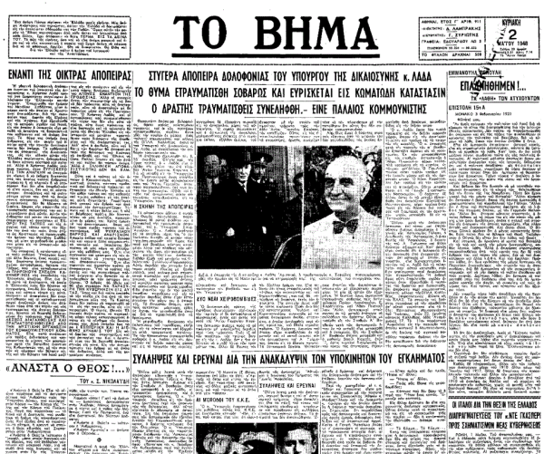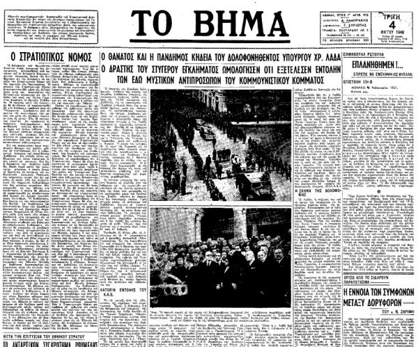 Ο πολιτικός και νομικός Χρήστος Λαδάς (είχε γεννηθεί το 1891) δολοφονήθηκε στο κέντρο της Αθήνας κατά τη διάρκεια του Εμφυλίου, την Πρωτομαγιά του 1948, Μεγάλο Σάββατο.