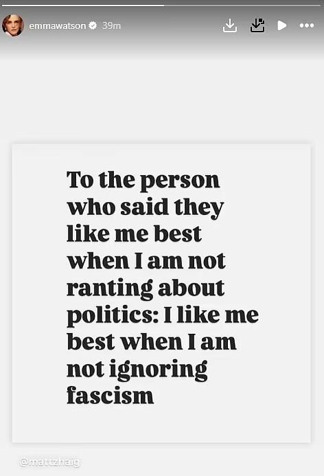 «Προς το άτομο που είπε ότι με προτιμάει όταν δεν παραπονιέμαι για την πολιτική: Με προτιμώ περισσότερο όταν δεν αγνοώ τον φασισμό» έγραψε η Γουάτσον κοινοποιώντας το μήνυμα της στους 73.3 εκατομμύρια ακολούθους της στο Instagram -το μήνυμα της είναι μια ατάκα του Βρετανού συγγραφέα Ματ Χέιγκ.