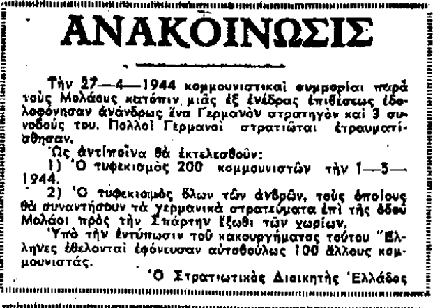 Στο απόσπασμα οδηγούνται 200 Έλληνες Κομμουνιστές. Εκτελούνται ως αντίποινα για τις ζωές τεσσάρων Γερμανών. Ένα στρατηγό και τρεις συνοδούς του.
