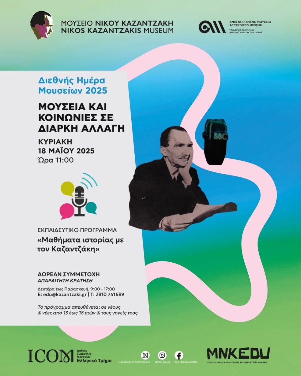 Παράλληλα την Κυριακή 18/5 και ώρα 11:00 θα διοργανώσει το εκπαιδευτικό πρόγραμμα με τίτλο «Μαθήματα ιστορίας με τον Καζαντζάκη» που θα υλοποιηθεί στην Μόνιμη Έκθεση του Μουσείου.
