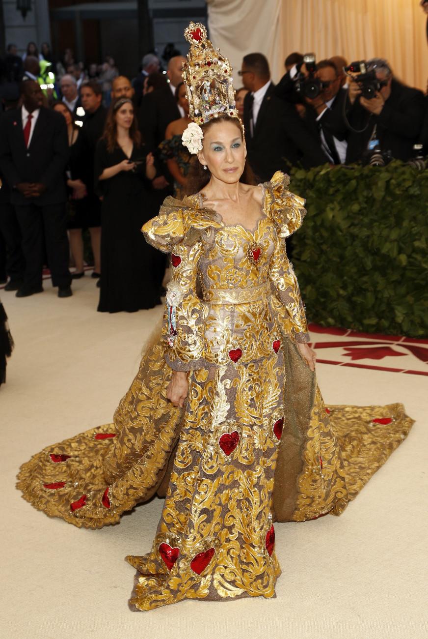 Η MVP του Met Gala, Σάρα Τζέσικα Πάρκερ τιμώντας το dress code «Catholic Imagination» έφτασε στο κόκκινο χαλί με ένα εντυπωσιακό Dolce & Gabbana φόρεμα με μακριά ουρά που διέθετε χρυσά κεντήματα σε όλο το μήκος του και κόκκινες καρδιές.
