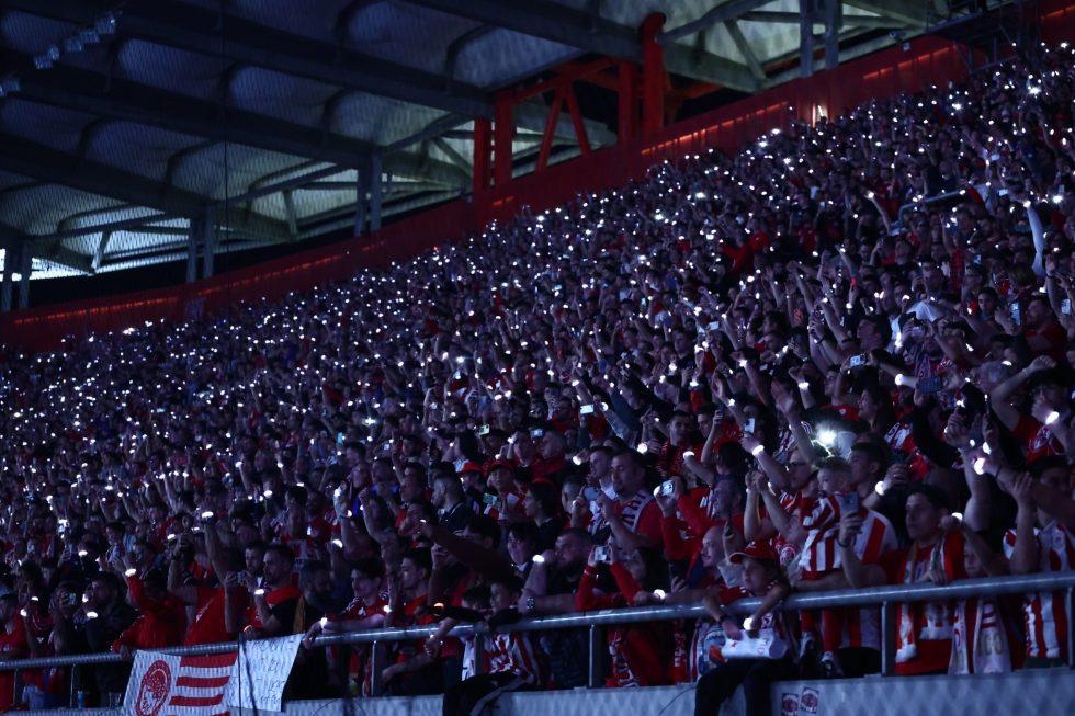 Ο Ολυμπιακός γιορτάζει την κατάκτηση του 48ου πρωταθλήματος στην ιστορία του και ο κόσμος του δημιούργησε φαντασμαγορική ατμόσφαιρα στο γήπεδο.