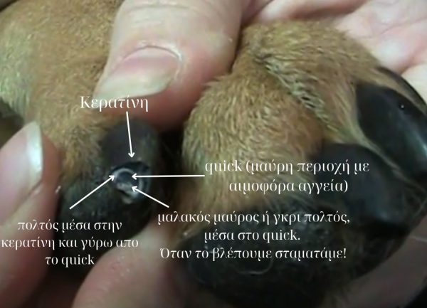 Πρέπει να γνωρίζετε ότι εσωτερικά τα νύχια του σκύλου έχουν αιμοφόρα αγγεία και νεύρα (quick). Το quick φαίνεται ροζ στα διαφανή νύχια, ενώ στα μαύρα, για να το διακρίνετε, χρειάζεται φως και προσοχή. Αν δείτε σκούρο κέντρο (pulp), σταματήστε – είστε κοντά στο ζωντανό μέρος.