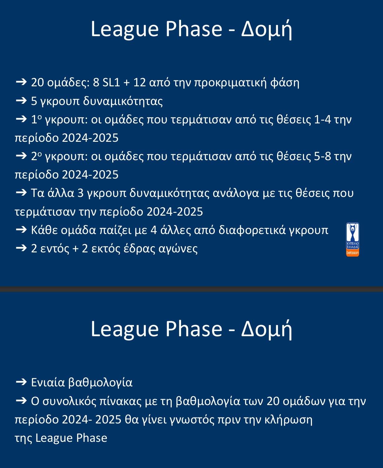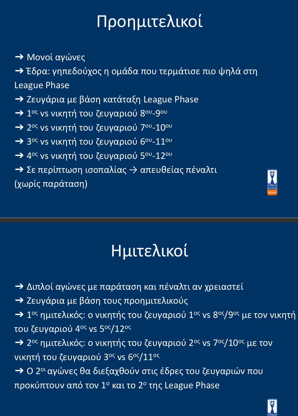 Αυτό εξασφαλίσει περισσότερα ανταγωνιστικά παιχνίδια υψηλού επιπέδου από νωρίς, σύμφωνα με όσα παρουσίασε και ο πρόεδρος της ΕΠΟ. Η πορεία προς τον τελικό στο ΟΑΚΑ θα έχει πλήρως καθορισμένο χρονοδιάγραμμα, διασφαλίζοντας τη διαφάνεια και την οργάνωση της διοργάνωσης. Η πρόκριση θα βασίζεται στη βαθμολογία της League Phase, χωρίς κληρώσεις, με σαφή ανταμοιβή για την καλή πορεία κάθε ομάδας.