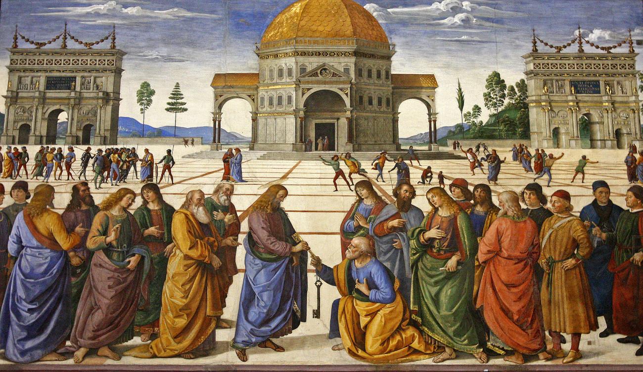 «Η παράδοση των κλειδιών στον Άγιο Πέτρο» του Πιέτρο Περουτζίνο (1481-1482) δείχνει τον Ιησού να παραδίδει τα κλειδιά του ουρανού στον Άγιο Πέτρο, τον πρώτο Πάπα.