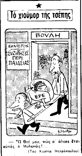Πόσο λίγο κοινός είναι ο κοινός νους και πόσο σπάνιο είδος η απλή λογική… Τίποτα πιο απλό από το θέμα του τρόπου της διδασκαλίας των αρχαίων στα σχολεία. Χρόνια το δουλεύουμε. Ούτε το Κέντρο (σ.σ. η Ένωσις Κέντρου, η τότε κυβερνητική παράταξη) στη σημερινή του μορφή, ούτε η ΕΡΕ (σ.σ. η τότε αντιπολίτευση) υπήρχαν τότε. Σε κάθε δε επανάληψη μάς άρχιζαν στο πετροβολητό. Ακόμα και οι λεγόμενοι προοδευτικοί εύρισκαν πολύ τολμηρό αυτό που υποστηρίζαμε: να περιορισθούν οι αρχαίοι στα κλασικά γυμνάσια, στα δε άλλα να διδάσκωνται σε μετάφραση.