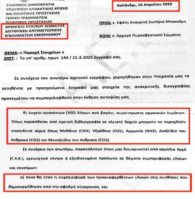 Έτσι λοιπόν στις 10 Απριλίου 2025 η ειδική ομάδα της Πυροσβεστικής απέστειλε έγγραφο προς τον εφέτη Σωτήρη Μπακαΐμη ώστε να εξετάσει και άλλους παράγοντες που συνέβαλαν στη δημιουργία της φονικής πυρόσφαιρας.