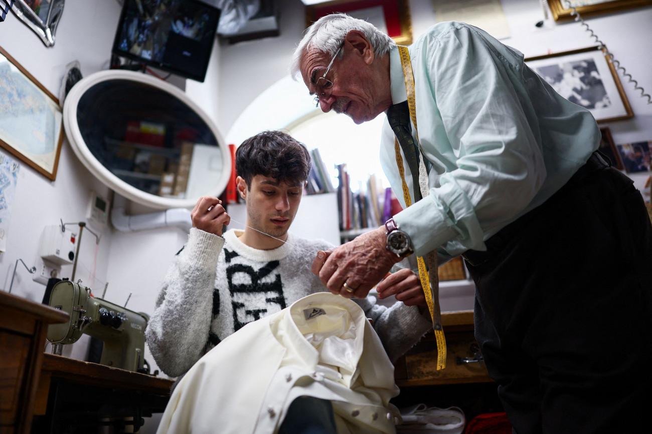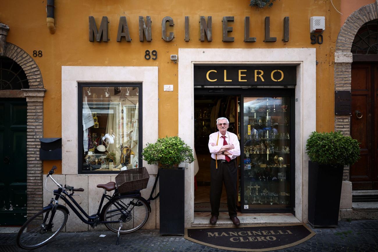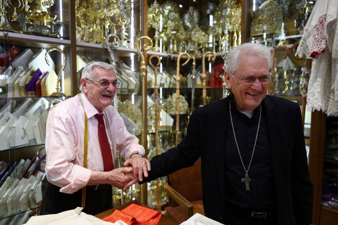 Λίγες ημέρες πριν από το κονκλάβιο, το μικρό ραφείο του είναι γεμάτο. Καρδινάλιοι, ιερείς που χρειάζονται ένα νέο ρωμαϊκό κολάρο, τουρίστες που αναζητούν αναμνηστικά, προσκυνητές του Ιωβηλαίου και ένα ρεύμα δημοσιογράφων και φωτογράφων συγκεντρώνονται γύρω από τον πάγκο.