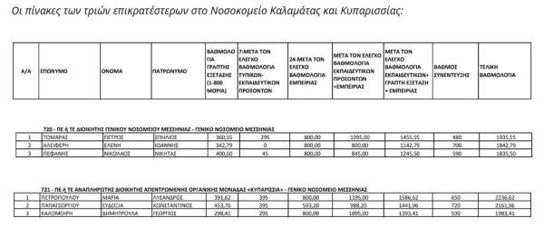 Ο πίνακας με τις βαθμολογίες των υποψήφιων για τα νοσοκομεία Καλαμάτας και Κυπαρισσίας.