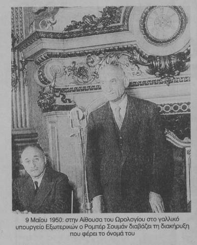 Στις 9 Μαΐου 1950, στην πέμπτη επέτειο της λήξης του Β’ Παγκοσμίου Πολέμου, ο Ρομπέρ Σουμάν, τότε υπουργός Εξωτερικών της Γαλλίας, εξήγγειλε επισήμως το σχέδιο που είχε εκπονήσει σε συνεργασία με το γάλλο οικονομικό και πολιτικό σύμβουλο Ζαν Μονέ αναφορικά με τη συγκρότηση της πρώτης Ευρωπαϊκής Κοινότητας.