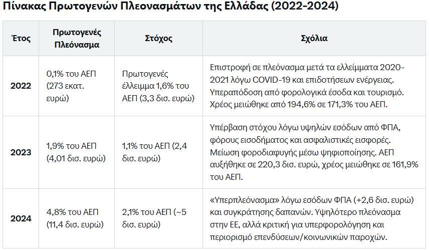 Σήμερα, η Ελλάδα δεν υπόκειται πλέον σε ρητές μνημονιακές δεσμεύσεις για συγκεκριμένα επίπεδα πρωτογενών πλεονασμάτων, όπως συνέβαινε έως το 2018. Η κυβέρνηση συνεχίζει να δεσμεύεται για πρωτογενή πλεονάσματα (2,4% του ΑΕΠ για 2025-2028), αντανακλώντας τη στρατηγική διατήρησης δημοσιονομικής πειθαρχίας και μείωσης του χρέους.