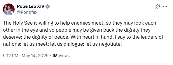 — Pope Leo XIV (@Pontifex) May 14, 2025