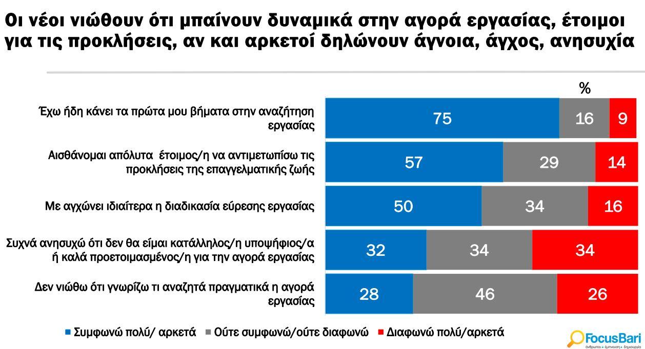 Το 57% των νέων αισθάνονται απόλυτα έτοιμοι να αντιμετωπίσουν τις προκλήσεις της επαγγελματικής ζωής, ενώ σε ποσοστό 50% σημείωσαν ότι τους αγχώνει ιδιαίτερα η διαδικασία εύρεσης, το 32% ότι ανησυχούν συχνά πως δεν θα είναι ο/η κατάλληλος/η υποψήφιος/α ή καλά προετοιμασμένος/η για την αγορά εργασίας, ενώ το 28% ότι δεν νιώθει πως γνωρίζει τι αναζητεί πραγματικά η αγορά εργασίας.