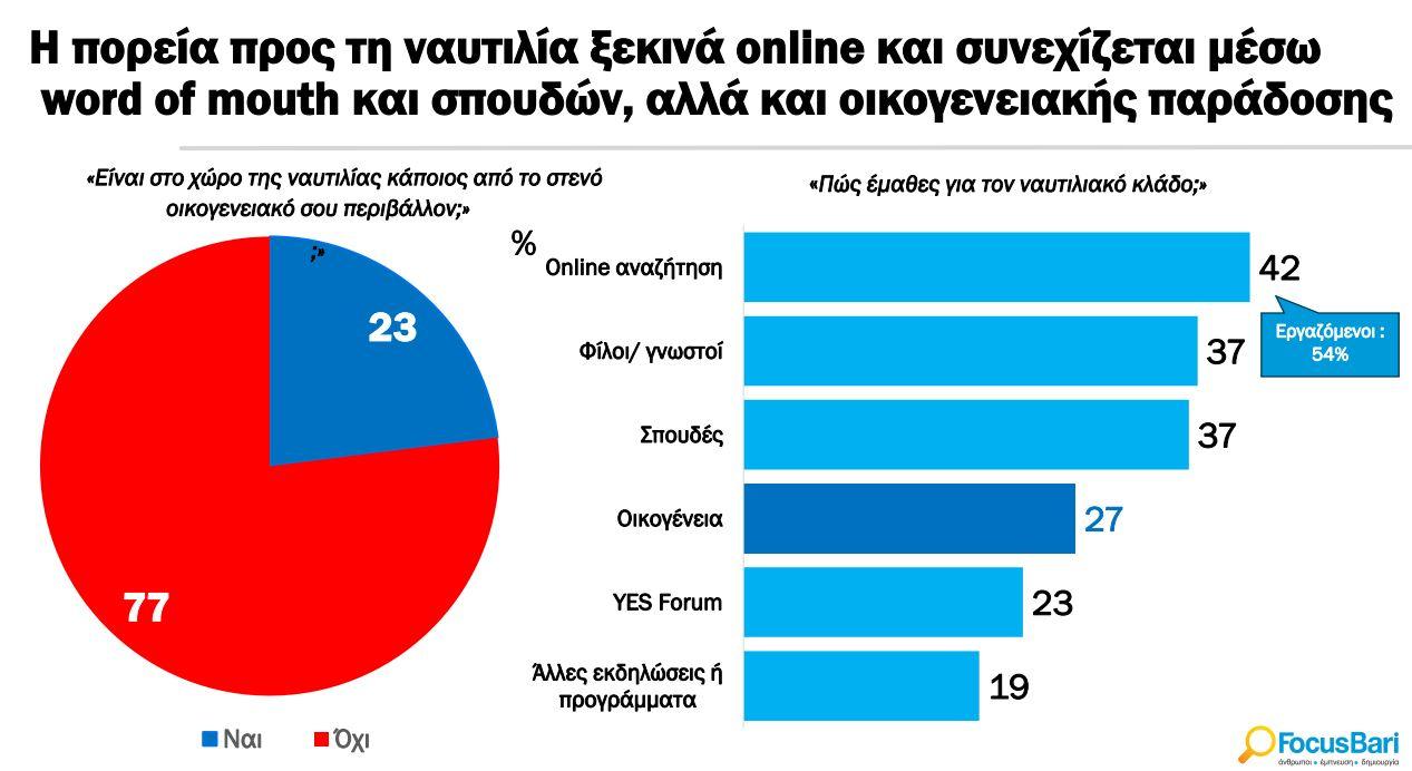 Στην ερώτηση εάν είναι στο χώρο της ναυτιλίας κάποιος από το στενό οικογενειακό τους περιβάλλον, το 77% απάντησε αρνητικά, ενώ αναφορικά με την αναζήτηση ευκαιριών, 8 στους 10 δήλωσαν ότι έχουν συμμετάσχει σε τουλάχιστον μία δράση, με τα Career Days να θεωρούνται τα πιο αποτελεσματικά.