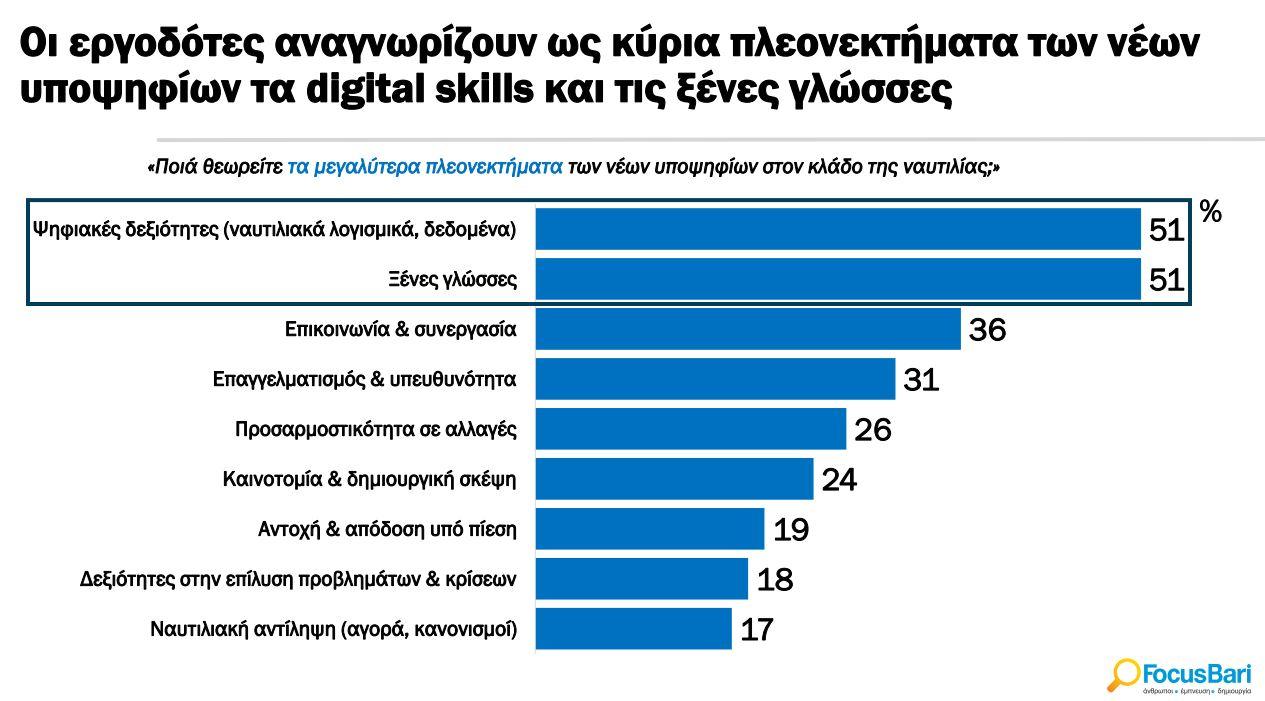 Επιπλέον, οι εργοδότες αναγνωρίζουν σταθερά ως κύρια πλεονεκτήματα των νέων υποψηφίων τα digital skills και τις ξένες γλώσσες σε ποσοστό 51%, την επικοινωνία και συνεργασία σε ποσοστό 36%, τον επαγγελματισμό και την υπευθυνότητα 31%, την προσαρμοστικότητα σε αλλαγές 26%, την καινοτομία και δημιουργική σκέψη 24%, την αντοχή και απόδοση υπό πίεση 19%, τις δεξιότητες στην επίλυση προβλημάτων και κρίσεων 18% και τη ναυτιλιακή αντίληψη σε ποσοστό 17%.