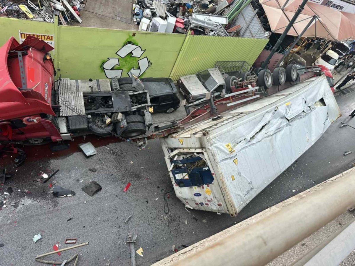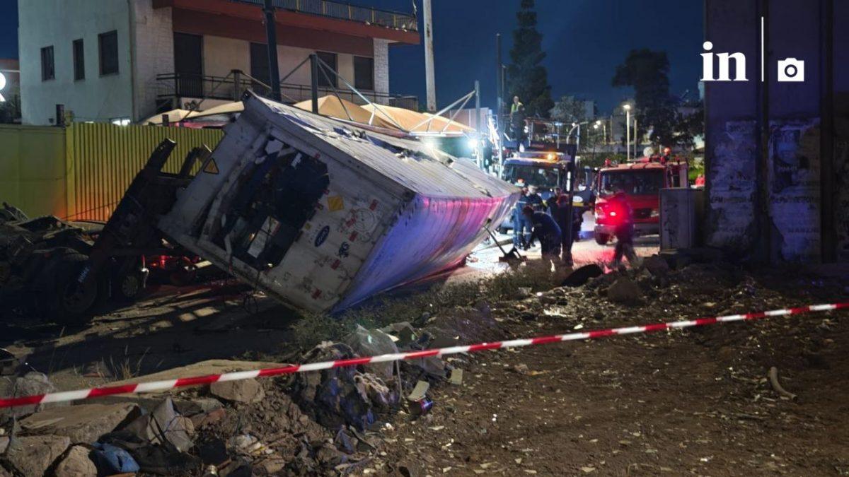 Το τροχαίο σημειώθηκε λίγο μετά τις 19.30. Η νταλίκα μετέφερε κρέατα και προσγειώθηκε πάνω σε δύο σταθμευμένα αυτοκίνητα.