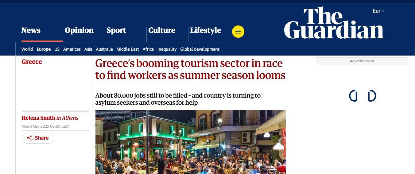 Αφορμή στάθηκε πρόσφατο ρεπορτάζ του Guardian για τις ελλείψεις εργατικών χεριών στην ελληνική τουριστική βιομηχανία: «Ο ακμάζων τουριστικός τομέας στην Ελλάδα κάνει αγώνα δρόμου για να βρει εργαζόμενους, εν όψει της θερινής σεζόν», είναι ο τίτλος του άρθρου, που υπογράφει η ανταποκρίτρια της εφημερίδας Έλενα Σμιθ. «Περίπου 80.000 θέσεις εργασίας παραμένουν κενές – και η χώρα στρέφεται προς τους αιτούντες άσυλο και το εξωτερικό για βοήθεια», διαπιστώνει το ρεπορτάζ.