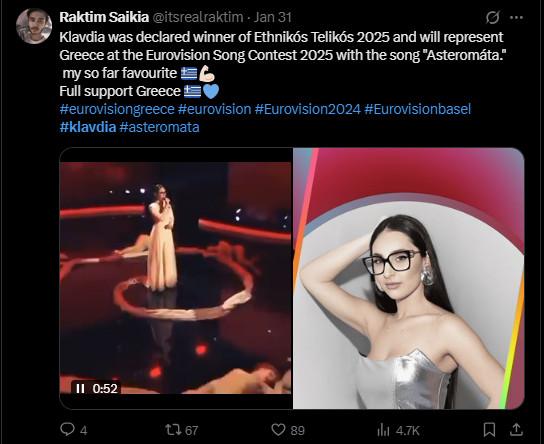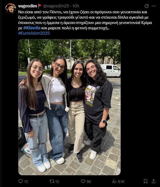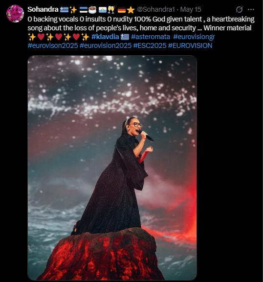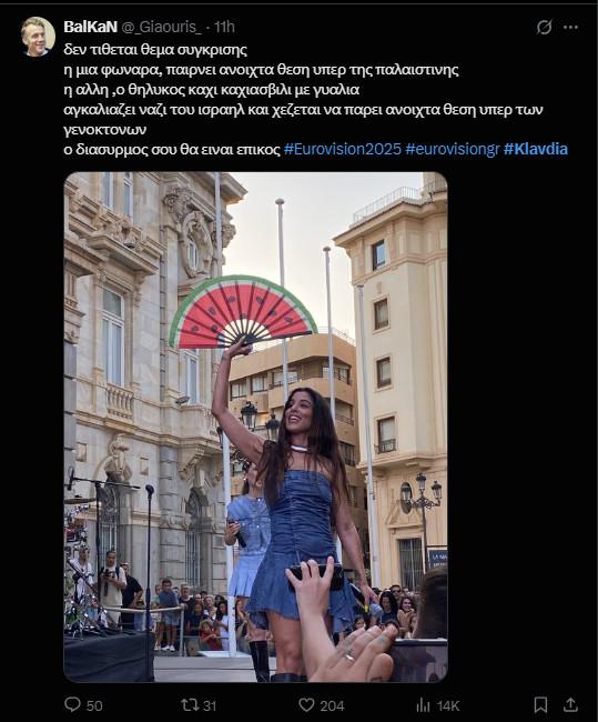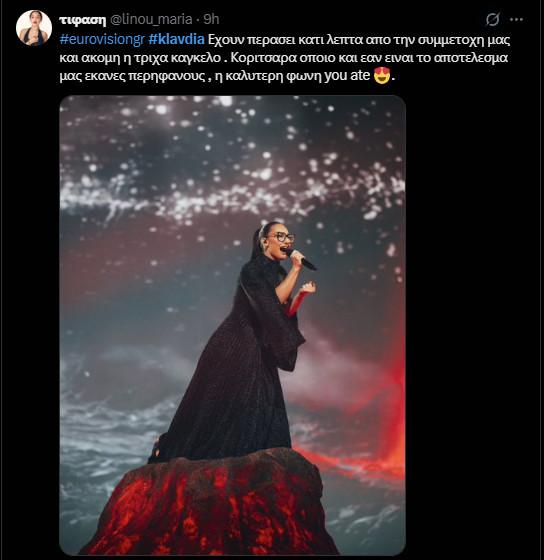 Aπό την άλλη βέβαια, δεν έλειψαν και εκείνοι που δυσαρεστήθηκαν από τη σχέση που διατήρησε η διαγωνιζόμενη της Ελλάδας με αυτή του Ισραήλ γράφοντας σχόλια όπως: «Να είσαι από τον Πόντο, να έχουν ζήσει οι πρόγονοι σου γενοκτονία και ξεριζωμό, να γράφεις τραγούδι γι’αυτό και να στέκεσαι δίπλα αγκαλιά με έποικους που ή έμμεσα ή άμεσα στηρίζουν μια σημερινή γενοκτονία! Κρίμα ρε #Klavdia και μαρεσε πολύ η φετινή συμμετοχή».
