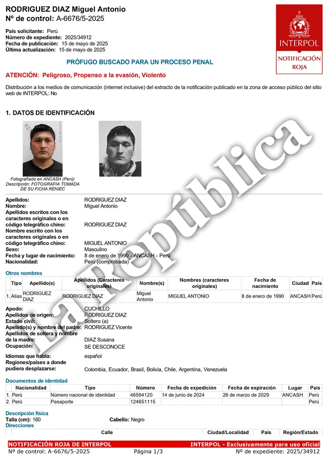 Σύμφωνα με τον ιστότοπο της Ιντερπόλ, ο Μιγκέλ Ροντρίγκεζ, γνωστός και ως «Cuchillo», είχε όντως ένταλμα σύλληψης που εκδόθηκε από τις αρχές του Περού, οι οποίες το δημοσίευσαν και απέστειλαν την αντίστοιχη ειδοποίηση αυτή την Πέμπτη 15 Μαΐου.
