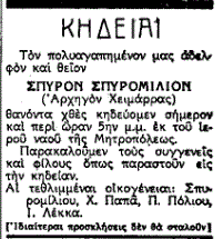 «Ατυχώς οι πολλοί των Ελλήνων», όπως γράφει ο «αρχηγός» στο γράμμα του προς τον Μαζαράκη, «εζαλίσθησαν κι’ έπεσαν εις τις κάλπες και τις δουλίτσες των». Ο Σπυρομήλιος έμεινε πάλι χωρίς πατρίδα. Τώρα πρέπει να ζητιανέψουμε τάφο γι’ αυτόν απ’ τους γειτόνους, που ελπίζω να μην τον αρνηθούν. Ο καημένος ο «αρχηγός» υπέφερε. Κι’ οι απ’ έξω πληγές άρχισαν να τον βασανίζουν χειρότερα κι’ από την από μέσα, τη μεγάλη. Δυο φορές τον δέχτηκε ο «Ευαγγελισμός». Αλλά στους πόνους του προστέθηκε κι’ η άλλη αρρώστεια που δέρνει όλους τους Έλληνες, όταν έχουν παστρικά τα χέρια. Υπέφερε διπλά και τρίδιπλα. Μα ήταν υπερήφανος, μιλιά. Όλοι τον είχανε ξεχάση. Όλοι εκτός από τον Βενιζέλο. Τον συνώδευσε τέλος χθες ως το νεκροταφείο.